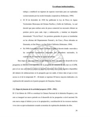 Un enfoque institucionalista... trabajo y estableció un régimen de especies reservadas para ser explotadas exclusivamente por las recién formadas cooperativas (Soberanes, 1994). • El 30 de diciembre de 1938 fue publicada la Ley de Pesca en Aguas Territoriales Mexicanas del Océano Pacífico y Golfo de California, la cual decretó que para realizar actos de pesca comercial era necesario obtener un permiso previo para cada viaje y embarcación, y tramitar un despacho denominado “Vía de Pesca”, los permisos generales de pesca se tramitarían en las oficinas del Departamento Forestal y de Caza y Pesca ubicadas en Ensenada, en San Diego y en San Pedro California (Soberanes, 1994). • En 1940 el presidente Lázaro Cárdenas expidió el decreto donde reservaba a las sociedades cooperativas integradas por pescadores nacionales, la explotación del camarón en aguas nacionales. Esta etapa es muy importante ya que sienta las bases del posterior desarrollo de las pesquerías en México y en especifico, de la pesquería de camarón de alta mar en el LPM, pero al ser una actividad en ciernes en aquellos momentos no existen registros disponibles del número de embarcaciones en la pesquería que nos atañe, el único dato al que se tuvo acceso es el de la temporada 39 – 40 donde se registran 20 barcos mayores dedicados a la explotación del camarón en el puerto pesquero de Guaymas, Sonora. 3.2. Etapa de fomento de la actividad pesquera (1950 – 1981). El 13 de febrero de 1950 se constituyó la Cámara Nacional de la Industria Pesquera y con esto se inauguró un nuevo periodo en el desarrollo de las pesquerías a nivel nacional. En esta nueva etapa el énfasis ya no es la apropiación y socialización de los recursos marinos vivos sino su aprovechamiento creando economías de explotación alrededor de ellos. 39