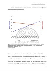 Un enfoque institucionalista... Todo lo anterior desembocó en un incremento desmedido del esfuerzo pesquero, como se muestra en la siguiente figura: 600 9000 8000 500 7000 Número de barcos 300 5000 Capturas promedio 400 6000 4000 200 3000 2000 100 1000 0 0 53-54 55-56 57-58 59-60 61-62 63-64 65-66 67-68 69-70 71-72 73-74 75-76 77-78 79-80 81-82 barcos capturas promedio Figura no. 11 Sobrecapitalización de la pesquería de camarón de alta mar con línea de tendencia, basada en datos del puerto de Guaymas, Sonora. Todas las temporadas comprendidas entre 1953 -1981. FUENTE: CIBNOR. 3.3. Etapa de regulación de la actividad basada en el cooperativismo (1982-1991). Antes de adentrarnos en esta etapa, es importante aclarar que a pesar de que el camarón se encontraba dentro del régimen de especies reservadas para el sector cooperativo, en la práctica esto era letra muerta, ya que a pesar de que las cooperativas tenían acceso reservado a la pesquería de camarón no tenían acceso a créditos que los hicieran dueños de 41