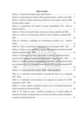 Índice de tablas. Tabla no. 1. Proporción de especie según región de pesca……………………………….. 4 Tabla no. 2. Composición por edad de la flota camaronera litoral – pacifico al año 2000.. 7 Tabla no. 3 Precios en dólares americanos por libra de cola de camarón a marzo de 2003 por talla, especie y origen………………………………………………………………… 10 Tabla no. 4. Importaciones de camarón al mercado estadounidense 1993 – 2002 (en millones de libras)………………………………………………………………………… 11 Tabla no. 5. Precios del camarón blanco mexicano por tallas a septiembre del 2003……. 12 Tabla no. 6. Barcos en la pesquería por número de mes en Guaymas, temporada 2001 - 2002………………………………………………………………………………………. 26 Tabla no.7. Fortalezas y debilidades de la herramienta de análisis costo – beneficio (ACB)…………………………………………………………………………………….. 32 Tabla no. 8. Años y acontecimientos importantes en el sector pesquero 1950 – 1981…… 40 Tabla no. 9. Ingreso, costo y utilidad por viaje de la flota industrial camaronera del LPM durante la temporada 2001 – 2002………………………………………………………... 48 Tabla no. 10. Duración de los viajes, ingreso diario, costo diario y utilidad por día de pesca de la flota industrial camaronera del LPM durante la temporada 2001 – 2002……. 49 Tabla no. 11. Empleos generados, remuneración por pescador y remuneración por día de pesca generados por la flota industrial camaronera del LPM durante la temporada 2001 – 2002……………………………………………………………………………………... 50 Tabla no. 12. La producción con un factor variable –esfuerzo pesquero-………………... 55 Tabla no. 13. Indicadores microeconómicos de producción básicos de la temporada 2001 – 2002……………………………………………………………………………….. 58 Tabla no. 14. Indicadores microeconómicos de la pesquería de camarón en el LPM, temporada no. 2001 - 2002……………………………………………………………….. 58 Tabla no. 15. Autor, método y resultado de estudios previos de redimensionamiento de la flota camaronera en alta mar del LPM…………………………………………………. 69 Tabla no. 16. Flujos de costos y beneficios generados por la política pública de reducción del número de embarcaciones en el litoral del Pacifico mexicano dedicadas a la captura de camarón de alta mar……………………………………………………….. 81