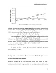 Análisis microeconómico... Figura no.18. Gráfico de dispersión, línea de tendencia y coeficiente de correlación entre porcentaje de la flota que se mantiene en operación y la utilidad obtenida por viaje de pesca. FUENTE: La encuesta aplicada durante los meses de julio, agosto y septiembre de 2003. Cono se muestra en la figura no. 18. existe una intensa correlación positiva entre utilidad por viaje y el porcentaje de la flota participando de la pesquería, es decir, a medida en que los premios por pescar disminuyen, los empresarios pesqueros toman la decisión de parar la producción y dejar de pescar. Lo anterior nos lleva a concluir que existe evidencia empírica de que nuestra hipótesis de trabajo no es falsa. 4.3. La función de producción de los barcos camaroneros del litoral pacifico mexicano con un factor variable – viajes de pesca-. Basados en la noción de que existe una fuerte relación entre utilidad por viaje y participación en la actividad y de que la utilidad por viaje de pesca depende de la cantidad 53