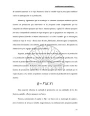 Análisis microeconómico... de camarón capturada en el viaje. Pasamos a aislar la variable viaje de pesca para establecer cuál es su participación en la producción. Primero y suponiendo que la tecnología es constante. Podemos establecer que los factores de producción que intervienen en la pesquería están comprendidos por las categorías de esfuerzo pesquero por barco, materias primas y capital. El esfuerzo pesquero por barco comprende la cantidad de viajes de pesca que se agreguen en una temporada. Las materias primas son todos los bienes relacionados a los costos variables que se utilizan para realizar un viaje de pesca – diesel, mano de obra, lubricantes, alimentos para la tripulación, refacciones de máquina y de cubierta, gastos de mantenimiento, entre otros-. El capital es la embarcación y los equipos de pesca que se utilizan. Segundo, podemos decir que la relación entre los factores del proceso de producción y la producción resultante se describe por medio de una función de producción. Una función de producción indica el nivel de producción (Q) que obtiene una empresa con cada combinación específica de factores. Para nuestro trabajo supondremos que sólo existen dos factores de producción: capital (K) y el esfuerzo pesquero por barco que está dado por lo viajes de pesca (V), siendo así podemos expresar la función de producción de la siguiente manera: Q = F (K ,V ) Esta ecuación relaciona la cantidad de producción con las cantidades de los dos factores, capital y esfuerzo pesquero por barco. Tercero, considerando el capital es fijo - un barco con su tecnología de captura-, pero el esfuerzo de pesca es variable, luego entonces, las embarcaciones pesqueras pueden 54