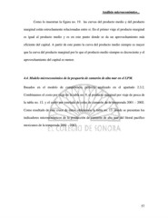 Análisis microeconómico... Como lo muestran la figura no. 19. las curvas del producto medio y del producto marginal están estrechamente relacionadas entre si. En el primer viaje el producto marginal es igual al producto medio y es en este punto donde se da un aprovechamiento más eficiente del capital. A partir de este punto la curva del producto medio siempre es mayor que la curva del producto marginal por lo que el producto medio siempre es decreciente y el aprovechamiento del capital es menor. 4.4. Modelo microeconómico de la pesquería de camarón de alta mar en el LPM. Basados en el modelo de competencia perfecta analizado en el apartado 2.3.2. Combinamos el costo por viaje de la tabla no. 9, el producto marginal por viaje de pesca de la tabla no. 12. y el costo por tonelada de colas de camarón de la temporada 2001 – 2002. Como resultado de este cruce de datos, obtenemos la tabla no. 13. donde se presentan los indicadores microecnómicos de la producción de camarón de alta mar del litoral pacifico mexicanos de la temporada 2001 - 2002. 57