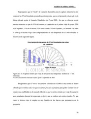 Análisis de política pública... Supongamos que el “stock” de camarón disponible para la captura industrial es del orden de las 17 mil toneladas promedio por temporada –que es el promedio observado en la última década según el Anuario Estadístico de Pesca 2002-. Lo que se observa, según nuestra encuesta, es que el 43% del recurso es capturado en el primer viaje de pesca, 23% en el segundo, 17% en el tercero, 10% en el cuarto, 5% en el quinto, y el restante 2% entre el sexto y el décimo viaje. Este comportamiento en una temporada de 17 mil toneladas se muestra en la siguiente figura. Una temporda de pesca de 17 mil toneladas de colas de camarón. 8 Miles de toneladas 5 7 6 4 3 2 1 0 12345678910 Viajes de pesca Figura no. 24. Capturas totales por viaje de pesca en una temporada modelo de 17 mil toneladas. FUENTE: La encuesta realizada en julio, agosto y septiembre de 2003. Imaginemos que el “stock” de camarón silvestre en el LPM es una cuenta de ahorro sobre la que se retira cada vez que se captura, lo que se propone para poder cumplir con el objetivo de estabilidad en el mercado laboral es que los retiros totales por viaje de camarón sean semejantes durante la temporada, es decir, que se realicen seis retiros iguales. Ya que como lo hemos visto el empleo es una función de los barcos que permanecen en la pesquería. 70