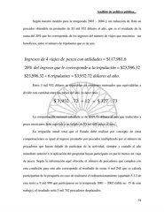 Análisis de política pública... Según nuestro modelo para la temporada 2003 – 2004 y sin reducción de flota un pescador obtendría en promedio de $3 mil 932 dólares al año, que es el resultado de la suma del 20% que les corresponde, de los ingresos del número de viajes que maximiza sus beneficios, entre el número de tripulantes que es de seis. Ingresos de 4 viajes de pesca con utilidades = $ 117 , 981 6 . 20 % del ingreso que le correspond e a la tripulació n = $ 23 , 596 . 32 $ 23 , 596 . 32 ÷ 6 tripulante = , 3 $ 932 . 72 dólares al año . s Estos 3 mil 932 dólares se repartirían en emisiones mensuales que equivaldrían a dividir esta cantidad entre los meses del año, es decir doce. $ , 3 932 . 72 ÷ 12 = $ 327 . 73 La compensación mensual calculada es de $327.73 dólares al mes que traducidos a pesos mexicanos debe equivale a un salario de $3 mil 600 pesos al mes. La erogación anual total que el Estado debe realizar por concepto de estas compensaciones es igual al ingreso promedio por pescador multiplicado por el número de pescadores que hayan dejado de participar de la actividad, siempre y cuando el año inmediato anterior a la aplicación del programa hayan participado en por lo menos un viaje de pesca. Según la información aquí ofrecida, el número de pescadores que cumplen con esta condición para este año corresponde al resultado de restar 4 mil 248 que se calcula participarían de la pesquería en caso de realizarse el redimensionamiento (apartado 5.3.2 de esta tesis) a 9 mil 990 que participaron en la temporada 2001 – 2002 (tabla no. 15 de este trabajo), el resultado sería 5 mil 742 pescadores desplazados. 79