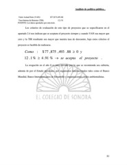 Análisis de política pública... Valor Actual Neto (VAN) $77,875,493.88 Tasa Interna de Retorno (TIR) 12.1% FUENTE: Los datos aportados por esta tesis. Los criterios de evaluación de este tipo de proyectos que se especificaron en el apartado 2.4 nos indican que se aceptara el proyecto siempre y cuando VAN sea mayor que cero y la TIR resultante sea mayor que nuestra tasa de descuento, bajo estos criterios el proyecto es factible de realizarse. Como : $ 77 , 875 , 493 . 88 ≥ 0 y 12 1 . % ≥ . 4 91 % → se acepta el proyecto . La erogación en el año 0 es muy elevada por lo que se recomienda sea cubierta, además de por el Estado mexicano, por organismos internacionales tales como el Banco Mundial, Banco Interamericanos de Desarrollo y organizaciones civiles ambientalistas. 81