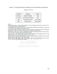 Cuadro 4.- La red de paisanaje de los capitanes en los cuatro presidios de la frontera de Sonora, 1771-1774 Presidios Capitanes Origen Fronteras Gabriel de Vildósola Vasco Terrenate José Antonio de Vildósola Vasco Tubac Juan Bautista de Anza Vasco criollo Altar Bernardo Urrea Vasco criollo Fuente: Correspondencia entre el coronel Domingo Elizondo y el virrey marqués de Croix. Pitic, 2 de enero de 1771. AGN, Provincias Internas, volumen 80, folio 4; Correspondencia entre el gobernador Crespo y el virrey Bucareli. San Miguel de Horcasitas, 23 de enero de 1774. AGN. Provincias Internas, volumen 96, folio 158; Correspondencia entre el ayudante de inspector Antonio de Bonilla y el gobernador Crespo. San Miguel de Horcasitas, 29 de abril de 1774. AGN. Provincias Internas, volumen 96, folios 183-185; Kessell, John L. 1976. Friars, Soldiers, and Reformers. Hispanic Arizona and the Sonora Mission Frontier. 1767-1856. Tucson: The University of Arizona Press. Pag. 104; Garate, Donald T. 1995. Basque Ethnic Connections and the Expeditions of Juan Bautista de Anza to Alta California. Colonial Latin American Historical Review IV (1): 71-73; Garate, Donald T. 1996. The Vildósola Family: A Sonoran Political, Military, and Ethnic Legacy. Colonial Latin American Historical Review V (4): 414-416 y 438; Sheridan, Thomas. 1999. Empire of Sand. The Seri Indians and the Strugle for Spanish Sonora, 1645-1803. Tucson: The University of Arizona Press. Pag. 243. 143