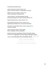 FUENTES DOCUMENTALES: Archivo General de la Nación, México, D.F. Ramos: Provincias Internas y Correspondencia Virreinal. Biblioteca Nacional de México, México, D.F. Archivo Franciscano, Fondo Reservado Archivo Histórico “José María Basagoiti Noriega” del Colegio San Ignacio de Loyola, Vizcaínas, México, D.F. Mapoteca Manuel Orozco y Berra, México, D.F. Arizona Historical Society, Tucson, Arizona, E.U.A. Departamento de Manuscritos y Colección de Microfilms. University of Arizona Main Library, Tucson, Arizona, E.U.A. Colección de Mapas. Archivo General de Indias, Sevilla, España. Ramo: Guadalajara. (Fuente compartida). Instituto Nacional de Antropología e Historia, Hermosillo, Sonora. Documentos microfilmados del Archivo Histórico Municipal de Parral. Archivo General del Estado de Sonora, Hermosillo, Sonora. 198