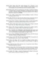 Sánchez Gómez, Miguel Ángel. 2007. Estudio Preliminar. En La Montaña en 1784. Informe a la junta de comercio y moneda, compilado por Antonio Diego de Tricio, 11-64. Santander: Servicio de Publicaciones de la Universidad de Cantabria. Sánchez Santiró, Ernest. 2010. Una modernización conservadora: el reformismo borbónico y su impacto sobre la economía, la fiscalidad y las instituciones. En Las reformas borbónicas, 1750-1808, coordinado por Clara García Ayluardo, 288- 295. México: CIDE, FCE, CONACULTA, INEHRM. Sanchiz, Javier. 2000. La familia Fagoaga. Apuntes genealógicos. Estudios de Historia Novohispana XXIII: 129-167. Santiago, Mark. 1994. The red captain. The life of Hugo O’Conor Commandant Inspector of the Interior Provinces of New Spain. Tucson: Arizona Historical Society. Schröter, Bernd. 2001. La frontera en hispanoamérica colonial: un estudio historiográfico comparativo. En Colonial Latin American Historial Review X (3): 351-385. Sheridan, Thomas. 1999. Empire of Sand. The Seri Indians and the Strugle for Spanish Sonora, 1645-1803. Tucson: The University of Arizona Press. Tibón, Gutierre. 1995. Diccionario etimológico comparado de los apellidos españoles, hispanoamericanos y filipinos. México: Fondo de Cultura Económica. Torres Chon, Iván Aarón. 2011. Identificación y reconstrucción de la red de apoyo a José Urrea en Sonora durante su conflicto armado con Manuel María Gándara 1837- 1845. Tesis de Maestría en Ciencias Sociales, El Colegio de Sonora. Trejo Contreras, Zulema. 2004. Redes, facciones y liberalismo. Sonora 1850-1876. Tesis de doctorado en Historia, El Colegio de Michoacán. Usunáriz Garayoa, Jesús. 1992. Una visión de la América del XVIII: Correspondencia de emigrantes guipuzcoanos y navarros. Bilbao: MAPFRE. Velarde Cadena, Jesús Dénica. 2012. Las compañías de indígenas auxiliares ópatas a finales del siglo XVIII. Tesis de maestría en Ciencias Sociales, El Colegio de Sonora. Velázquez, María del Carmen. 1982. La frontera norte y la experiencia colonial. México: Secretaría de Relaciones Exteriores. Verdugo de Juárez, Isabel. 1994. El noroeste: Sonora. En Visión histórica de la frontera norte de México. Tomo II. De los aborígenes al septentrión novohispano, 179-218. Mexicali: Universidad Autónoma de Baja California, Editorial Kino, El Mexicano. Viveros, Germán. 1981. Origen y evolución del presidio de San Miguel de Horcasitas, Sonora. Estudios de Historia Novohispana VII: 199-270. 205
