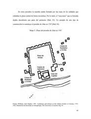 En otros presidios la muralla estaba formada por las casas de los soldados que rodeaban la plaza central de forma inconclusa. Por lo tanto, el “casa-muro” que se formaba dejaba descubierta una parte del perímetro (Ibid, 52). Un ejemplo de este tipo de construcción lo constituye el presidio de Altar en 1767 (Ibid, 54). Mapa 5.- Plano del presidio de Altar en 1767 Fuente: Williams, Jack Stephen. 1991. Architeture and defense on the military frontier of Arizona, 1752- 1856. Disertación de doctorado en Antropología, The University of Arizona. Pag. 54. 42