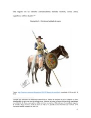 silla vaquera con las cubiertas correspondientes llamadas mochilla, coraza, armas, 16 coginillos y estribos de palo”. Ilustración 2.- Retrato del soldado de cuera Fuente: http://francisco-castracane.blogspot.mx/2012/07/dragon-de-cuera.html, consultada el 10 de abril de 2014. 16 Estado que manifiesta con distinción de Provincias el número de Presidios de que se compone la nueva línea formada de mar a mar para la defensa de sus fronteras, así como la fuerza efectiva de sus guarniciones con distinción de clases, y por quién se hallan provistos los empleos. Elaborado por el comandante inspector de presidios Hugo O’conor, el 30 de enero de 1776 en el presidio de San Fernando del Carrizal. AGN, Provincias Internas volumen. 88, folio 281. 47