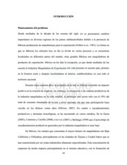 INTRODUCCIÓN Planteamiento del problema Desde mediados de la década de los sesenta del siglo XX se presentaron cambios importantes en diversas regiones de los países subdesarrollados debido a la presencia de fábricas productoras de manufacturas para la exportación (Fröbel et al., 1981). La forma en que se fabrican los artículos hoy en día se divide en varios procesos y se encuentran localizados en diferentes partes del mundo; estas grandes fábricas son maquiladoras de productos de exportación. México no ha sido la excepción, ya que desde mediados de los sesenta la Industria Maquiladora de Exportación IME está presente en nuestro país, primero en la frontera norte y después localizándose al interior, estableciéndose en casi todo el territorio nacional. Durante estos cuarenta años, la presencia de la IME en México ha tenido un impacto positivo en la creación de empleos; sin embargo, la integración a las cadenas productivas de la industria maquiladora no ha sido notable, al participar este sector sólo con el 10% del total de consumo intermedio de la IME a nivel nacional, sin que esta participación haya crecido en los últimos veinte años (Ollivier, 2007). En cuanto a encadenamientos productivos y derramas tecnológicas, se ha encontrado en varios estudios, De la Garza (2005), Contreras y Carrillo (2004), UNCTAD (2007) y Berlanga (1999) que el porcentaje de encadenamientos productivos generados por la industria maquiladora es muy bajo. En México, los estados que concentran el mayor número de maquiladoras son Baja California y Chihuahua, principalmente en las ciudades de Tijuana y Ciudad Juárez que se han caracterizado por ser zonas industriales altamente especializadas. Esta concentración de empresas ha tenido impacto principalmente en el sistema educativo, con la formación de 10