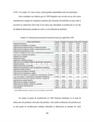 6.39%. Ver cuadro 19. Como vemos, existen grandes disparidades entre los municipios. Estos resultados nos indican que en 1999 Empalme solo invertía en un sólo sector manufacturero (equipo de transporte) mientras que Guaymas diversificaba un poco más la inversión en capital fijo sobre todo en las ramas que sobresalían en producción en ese año (la industria alimentaria, prendas de vestir y en la refinación de petróleo). Cuadro 19. Estructura porcentual de formación bruta de capital fijo 1999 Rama manufacturera Cajeme Empalme Guaymas Hermosillo Nogales Industria alimentaria 69.3% 0.0% 15.3% 19.2% 0.6% Industria de las bebidas y del tabaco 21.3% 2.4% 0.1% 3.3% 0.4% Fabricación de insumos textiles y acabado de textiles 0.0% 0.0% 0.1% 0.0% 0.0% Fabricación de productos textiles, excepto prendas de vestir 0.0% 0.0% 0.0% 0.2% 0.0% Fabricación de prendas de vestir 0.1% 0.0% 17.5% 2.4% 60.4% Curtido y acabado de cuero y piel, y fabricación de productos de cuero, piel y materiales sucedáneos 0.0% 0.0% 0.0% 0.0% 0.0% Industria de la madera 0.1% 0.0% 0.0% 0.0% 0.0% Industria del papel 0.1% 0.0% 0.0% 0.1% 0.0% Impresión e industrias conexas 0.1% 0.0% 0.0% 3.8% 0.1% Fabricación de productos derivados del petróleo y del carbón 4.1% 0.0% 64.0% 2.9% 4.8% Industria química 1.4% 0.0% 0.0% 0.2% 0.0% Industria del plástico y del hule 1.0% 0.0% 0.0% 3.4% 0.1% Fabricación de productos a base de minerales no metálicos 1.3% 0.6% 0.0% 3.5% 0.5% Industrias metálicas básicas 0.0% 0.0% 0.0% 0.0% 0.2% Fabricación de productos metálicos 0.2% 0.0% 0.0% 1.2% 1.5% Fabricación de maquinaria y equipo 1.1% 0.0% 0.0% 1.3% 1.0% Fabricación de equipo de computación, comunicación, medición y de otros equipos, componentes y accesorios electrónicos 0.0% 0.0% 0.3% 1.8% 23.2% Fabricación de accesorios, aparatos eléctricos y equipo de generación de energía eléctrica 0.0% 0.0% 0.0% 1.1% 0.4% Fabricación de equipo de transporte 0.0% 91.9% 2.5% 55.2% 6.4% Fabricación de muebles, colchones y persianas 0.0% 5.1% 0.0% 0.2% 0.2% Otras industrias manufactureras 0.0% 0.0% 0.0% 0.1% 0.0% Total Región 100.0% 100.0% 100.0% 100.0% 100.0% Fuente: Elaboración propia, con base en los Censos Económicos, INEGI (1999). En cuanto al grado de tecnificación en 1999 Guaymas destacaba en la rama de fabricación de productos derivados del petróleo y del carbón (refinación del petróleo) por su alto grado de tecnificación; también sobresalía la fabricación de prendas de vestir 109