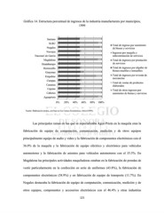 Gráfica 14. Estructura porcentual de ingresos de la industria manufacturera por municipios, 1999 Santana SLRC Total de ingreso por suministro Nogales de bienes y servicios Navojoa Ingresos por maquila y Nacozari de García subcontratación de servicios Magdalena Total de ingresos por prestación Huatabampo de servicios Hermosillo Total de ingresos por alquiler de Guaymas bienes muebles e inmuebles Empalme Total de ingresos por reventa de mercancías Cumpas Total de ventas de productos Cananea elaborados Cajeme Total de otros ingresos por Caborca suministro de bienes y servicios Aguaprieta 0% 20% 40% 60% 80% 100% Fuente: Elaboración propia, con base en los Censos Económicos, INEGI (1999). Las principales ramas en las que se especializaba Agua Prieta en la maquila eran la fabricación de equipo de computación, comunicación, medición y de otros equipos principalmente equipo de audio y video y la fabricación de componentes electrónicos con el 36.0% de la maquila y la fabricación de equipo eléctrico y electrónico para vehículos automotores y la fabricación de asientos para vehículos automotores con el 35.5%. En Magdalena las principales actividades maquiladoras estaban en la fabricación de prendas de vestir particularmente en la confección en serie de uniformes (43.8%), la fabricación de componentes electrónicos (38.9%) y en fabricación de equipo de transporte (11.7%). En Nogales destacaba la fabricación de equipo de computación, comunicación, medición y de otros equipos, componentes y accesorios electrónicos con el 46.4% y otras industrias 121