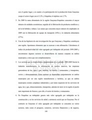 con el quinto lugar y en cuanto a la participación de la producción bruta Guaymas ocupa el octavo lugar con el 2.2% y Empalme el séptimo con 2.7%. 3. En 2009 la rama alimentaria de la región Guaymas-Empalme concentra el mayor número de unidades económicas; seguida de la fabricación de productos metálicos y de la de bebidas y tabaco. Las ramas que concentra mayor número de empleados en 2009 son la fabricación de equipo de transporte (54%) y la industria alimentaria (27%). 4. Una de las hipótesis de esta investigación fue que Guaymas y Empalme constituyen una región. Aportamos elementos que se acercan a esta afirmación. Calculamos el índice de productividad del valor agregado por trabajador del periodo 1999-2009 y encontramos algunos sectores se desarrollaron de manera conjunta en ambos municipios y otros que son complementarios. 5. Los sectores que se desarrollaron conjuntamente en el periodo 1999-2009 fueron la industria manufacturera, la información de medios masivos, las empresas generadoras de luz, agua y gas; también, los hoteles y restaurantes, y transportes, correo y almacenamiento. Estos sectores se desarrollan conjuntamente en ambos municipios por ser una región manufacturera y turística, ya que en ambos municipios existen complejos industriales y por tanto requieren de los servicios de agua, luz y gas, almacenamiento, transportes, además de tener en la región al puerto más importante de Sonora y por ello, el sector de hoteles y restaurantes. 6. En Empalme un trabajador genera más valor agregado por trabajador en la construcción y en los servicios de salud y asistencia social que en Guaymas. Por el contrario en Guaymas el valor agregado por trabajador se concentra en varios sectores, tales como el pesquero, comercio, servicios financieros y de seguros, 133