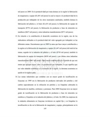 mil pesos en 2009. En la productividad por rama destaca en la región la fabricación de maquinaria y equipo ($1,681 mil pesos) la cual es mayor a la productividad de la producción por trabajador de los otros municipios analizados, también destaca la fabricación del plástico y el hule ($1,435 mil pesos); la fabricación de equipo de transporte ($776 mil pesos); la fabricación de productos a base de minerales no metálicos ($627 mil pesos) y otras industrias manufactureras ($571 mil pesos). 15. En relación a la contribución al desarrollo económico de la región, uno de los indicadores utilizados es la productividad del valor agregado por trabajador en las diferentes ramas. Encontramos que en 2009 la rama que hace mayor contribución a la región es la fabricación de maquinaria y equipo ($1,447 mil pesos) del total de las ramas; seguido de la industria del plástico y el hule ($730 mil pesos); también la fabricación de equipo de transporte ($658 mil pesos) y por último otras industrias manufactureras ($467 mil pesos). Hace mayor contribución en el sentido de que son ramas que agregan mayor valor a la producción por trabajador, lo que significa que ese valor añadido contribuye a la economía de la región. La derrama económica se queda en la región o país. 16. Las ramas industriales que contaban con un mayor grado de tecnificación en Guaymas en 1999 era la fabricación de productos derivados del petróleo y del carbón especialmente en la refinación de petróleo y en Empalme sobresalía la fabricación de muebles, colchones y persianas. Para 2004 Guaymas tuvo un mayor grado de tecnificación en la fabricación de productos a base de minerales no metálicos y Empalme en la industria del plástico y el hule. En 2009, las empresas de la industria alimentaria en Guaymas invirtieron en capital fijo y en Empalme la tecnificación se dio en la fabricación de maquinaria y equipo, principalmente en la 137