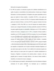 fabricación de maquinas fotocopiadoras. 17. En 1999, de acuerdo a la estructura de gastos de la industria manufacturera en la región, los gastos se concentraban en las materias primas e insumos que se integran físicamente a los bienes producidos. En Empalme otros gastos importantes eran los pagos por alquiler de bienes muebles e inmuebles (25.25%) y otros gastos por consumo de bienes y servicios (33.52%). En Guaymas también destacaban otros gastos por consumo de bienes y servicios (25.65%) y pago por consumo de envases y empaques (11.36%). Para 2009, en el caso de Guaymas las materias primas e insumos que se integran físicamente a los bienes producidos aumentó al 43.43% de sus gastos seguido del gasto en combustible y lubricantes con el 12.39%; también el consumo de envases y empaques con el 11.18% y el alquiler de bienes muebles e inmuebles con el 10.22% sumando el 83.02% de sus gastos. En el caso de Empalme los gastos se distribuían de la siguiente manera: materias primas e insumos 42.14%; consumo de energía eléctrica 13.80%; alquiler de bienes muebles e inmuebles 13.51%; otros gastos por consumo de bienes y servicios 12.99% y pago por maquila y subcontratación de servicios 9.64%. Cabe destacar que en este último gasto (gasto por maquila) en comparación con los quince municipios analizados Empalme es el que ejercía mayor gasto en este rubro. Con el análisis de la estructura de gastos nos damos cuenta que la mayor parte de los gastos de la industria manufacturera en Guaymas y Empalme se concentra en las materias primas e insumos y solo una pequeña parte al consumo de energía eléctrica, a las rentas de bienes muebles e inmuebles y al consumo de envases y empaques. 18. La variable ingresos por maquila y subcontratación de servicios destacan en algunos municipios de los quince analizados. Los municipios que se consideraron 138
