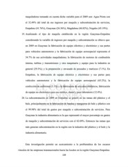 maquiladoras tomando en cuenta dicha variable para el 2009 son: Agua Prieta con el 32.49% del total de sus ingresos por maquila y subcontratación de servicios, Empalme (41.76%), Guaymas (26.36%), Magdalena (44.82%), Nogales (43.19%). 19. Analizando el tipo de maquila establecida en la región Guaymas-Empalme considerando la variable de ingresos por maquila y subcontratación se obtuvo que: en 2009 en Guaymas la fabricación de equipo eléctrico y electrónico y sus partes para vehículos automotores y la fabricación de equipo aeroespacial representa el 54.7% de sus actividades maquiladoras; la fabricación de motores de combustión interna, turbina y transmisiones y otra maquinaria y equipo para la industria en general (29.3%); y la preparación y envasado de pescados y mariscos (7.1%). En Empalme, la fabricación de equipo eléctrico y electrónico y sus partes para vehículos automotores y la fabricación de equipo aeroespacial (65.2%), la confección de uniformes (5.1%) y la fabricación de artículos oftálmicos, fabricación de equipo no electrónico para uso médico, dental y para laboratorio (12.4%). 20. La subcontratación en 2009 en Empalme se generó en las ramas del plástico y el hule, principalmente en la fabricación de bandas y mangueras de hule y plástico con el 99.98% del total de gastos por maquila o subcontratación de servicios. Para Guaymas la industria alimentaria es la que representó el mayor porcentaje en gastos de maquila y subcontratación de servicios con el 82.09%. Entonces las ramas que más generan subcontratación en la región son la industria del plástico y el hule y la industria alimentaria. Esta investigación permite un acercamiento a la problemática de los escasos vínculos de las empresas transnacionales hacia las locales en la región Guaymas-Empalme. 139