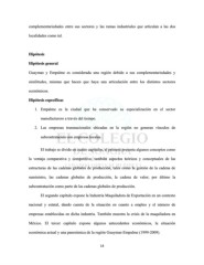 complementariedades entre sus sectores y las ramas industriales que articulan a las dos localidades como tal. Hipótesis Hipótesis general Guaymas y Empalme es considerada una región debido a sus complementariedades y similitudes, mismas que hacen que haya una articulación entre los distintos sectores económicos. Hipótesis específicas 1. Empalme es la ciudad que ha conservado su especialización en el sector manufacturero a través del tiempo. 2. Las empresas transnacionales ubicadas en la región no generan vínculos de subcontratación con empresas locales. El trabajo se divide en cuatro capítulos, el primero presenta algunos conceptos como la ventaja comparativa y competitiva; también aspectos teóricos y conceptuales de las estructuras de las cadenas globales de producción, tales como la gestión de la cadena de suministro, las cadenas globales de producción, la cadena de valor; por último la subcontratación como parte de las cadenas globales de producción. El segundo capítulo expone la Industria Maquiladora de Exportación en un contexto nacional y estatal, dando cuenta de la situación en cuanto a empleo y el número de empresas establecidas en dicha industria. También muestra la crisis de la maquiladora en México. El tercer capítulo expone algunos antecedentes económicos, la situación económica actual y una panorámica de la región Guaymas-Empalme (1999-2009). 14