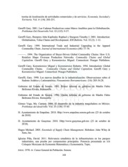 teorías de localización de actividades comerciales y de servicios. Economía, Sociedad y Territorio. Vol. IV (14): 203-251. Gereffi Gary. 2001. Las Cadenas Productivas como Marco Analítico para la Globalización. Problemas Del Desarrollo.Vol. 32 (125): 9-37. Gereffi Gary, Humprey John Kaplinsky Raphael y Sturgeon Timothy J. 2001. Introduction: Globalisation, Value Chains and Development. IDS Bulletin. Vol. 32 (3): 1-12. Gereffi Gary. 1999. International Trade and Industrial Upgrading in the Apparel Commodity Chain. Journal of International Economics.(48): 37-70. ———. 1994. The Organization of Buyer-Driven Global Commodity Chains: How U.S. Retailers Shape Overseas Production Networks. Commodity Chains and Global Capitalism. Gereffi Gary y Korzeniewicz Miguel. Connecticut: Praeger Publishers. Gereffi Gary, Korzeniewicz Miguel y Korzeniewicz Roberto. 1994. Introduction: Global Commodity Chains. Commodity Chains and Global Capitalism. Gereffi Gary y Korzeniewicz Miguel. Connecticut: Praeger Publishers. Gereffi, Gary. 1990. Los nuevos desafíos de la industrialización: Observaciones sobre el Sudeste Asiático y Latinoamérica. Pensamiento Iberoamericano. (16): 205-34.28. Gobierno del Estado de Sonora. 1992. Primer informe de gobierno de Manlio Fabio Beltrones Rivera. Hermosillo Gobierno del Estado de Sonora. 1996. Quinto informe de gobierno de Manlio Fabio Beltrones Rivera. Hermosillo Gómez Vega, Ma. Carmen. 2004. El desarrollo de la industria maquiladora en México. Problemas del desarrollo. Vol. 35 (138): 57-83 H. Ayuntamiento de Empalme. 2010. Http://www.empalme.sonora.gob.mx (23 de octubre de 2010) H. Ayuntamiento de Guaymas. 2010. Http://www.guaymas.gob.mx (23 de octubre de 2010). Hugos Michael. 2003. Essentials of Supply Chain Management. Hoboken: John Wiley & Sons, Inc. Iglesias Piña, David. 2011. Relevancia estadística de la infraestructura en los parques industriales, una prueba por componentes principales. Ponencia presentada en XXI Coloquio Mexicano de Economía Matemática y Econometría. Tepic. INEGI. 1970. IX Censo General de Población. Sonora 143