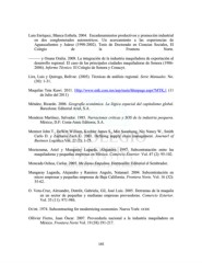Lara Enríquez, Blanca Esthela. 2004. Encadenamientos productivos y promoción industrial en dos conglomerados automotrices. Un acercamiento a las experiencias de Aguascalientes y Juárez (1990-2002). Tesis de Doctorado en Ciencias Sociales, El Colegio de la Frontera Norte. ——— y Osuna Oralia. 2008. La integración de la industria maquiladora de exportación al desarrollo regional. El caso de las principales ciudades maquiladoras de Sonora (1986- 2006). Informe Técnico. El Colegio de Sonora y Conacyt. Lira, Luis y Quiroga, Bolívar. (2003). Técnicas de análisis regional. Serie Manuales. No. (30): 1-31. Maquilas Teta Kawi. 2011. Http://www.mtk.com.mx/asp/main/hhmpage.aspx?MTK,1 (11 de Julio del 2011) Méndez, Ricardo. 2006. Geografía económica. La lógica espacial del capitalismo global. Barcelona: Editorial Ariel, S.A. Mendoza Martínez, Salvador. 1985. Narraciones criticas y SOS de la industria pesquera. México, D.F: Costa-Amic Editores, S.A. Mentzer John T., DeWitt William, Keebler James S., Min Soonhong, Nix Nancy W., Smith Carlo D. y Zacharia Zach G. 2001. Defining supply chain management. Journarl of Business Logistics.Vol. 22 (2): 1-25. Moctezuma, Ariel y Mungaray Lagarda, Alejandro. 1997. Subcontratación entre las maquiladoras y pequeñas empresas en México. Comercio Exterior. Vol. 47 (2): 95-102. Moncada Ochoa, Carlos. 2005. Me llamo Empalme. Hermosillo: Editorial el Sembrador. Mungaray Lagarda, Alejandro y Ramirez Angulo, Natanael. 2004. Subcontratación en micro empresas y pequeñas empresas de Baja California. Frontera Norte. Vol. 16 (32): 35-62. O. Vera-Cruz, Alexandre, Dutréit, Gabriela, Gil, José Luis. 2005. Derramas de la maquila en un sector de pequeñas y medianas empresas proveedoras. Comercio Exterior. Vol. 55 (11): 971-986. OCDE. 1974. Subcontracting for modernizing economies. Nueva York: OCDE Ollivier Fierro, Juan Óscar. 2007. Proveeduría nacional a la industria maquiladora en México. Frontera Norte Vol. 19 (38):191-217. 145