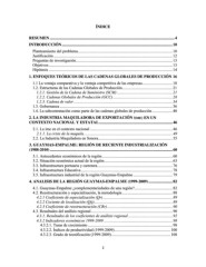 ÍNDICE RESUMEN ............................................................................................................................ 4 INTRODUCCIÓN .............................................................................................................. 10 Planteamiento del problema .............................................................................................. 10 Justificación ...................................................................................................................... 12 Preguntas de investigación ................................................................................................ 13 Objetivos ........................................................................................................................... 13 Hipótesis ........................................................................................................................... 14 1. ENFOQUES TEÓRICOS DE LAS CADENAS GLOBALES DE PRODUCCIÓN 16 1.1 La ventaja comparativa y la ventaja competitiva de las empresas .............................. 18 1.2. Estructuras de las Cadenas Globales de Producción .................................................. 21 1.2.1. Gestión de la Cadena de Suministro (SCM) ....................................................... 21 1.2.2. Cadenas Globales de Producción (GCC) ........................................................... 28 1.2.3. Cadena de valor .................................................................................................. 34 1.3. Gobernanza ................................................................................................................ 36 1.4. La subcontratación como parte de las cadenas globales de producción .................... 40 2. LA INDUSTRIA MAQUILADORA DE EXPORTACIÓN (IME) EN UN CONTEXTO NACIONAL Y ESTATAL ......................................................................... 46 2.1. La ime en el contexto nacional .................................................................................. 46 2.1.1. La crisis de la maquila ........................................................................................ 49 2.2. La Industria Maquiladora en Sonora.......................................................................... 55 3. GUAYMAS-EMPALME: REGIÓN DE RECIENTE INDUSTRIALIZACIÓN (1988-2010) .......................................................................................................................... 60 3.1. Antecedentes económicos de la región ...................................................................... 60 3.2. Situación económica actual de la región .................................................................... 63 3.3. Infraestructura portuaria y carretera ........................................................................... 76 3.4. Infraestructura Educativa ........................................................................................... 78 3.5. Infraestructura industrial de la región Guaymas-Empalme ....................................... 79 4. ANALISIS DE LA REGIÓN GUAYMAS-EMPALME (1999-2009) ........................ 82 4.1. Guaymas-Empalme ¿complementariedades de una región?...................................... 82 4.2. Reestructuración y especialización, la metodología .................................................. 88 4.2.1 Coeficiente de especialización (Qr) ..................................................................... 89 4.2.2 Cociente de localización (Qij).............................................................................. 89 4.2.3 Coeficiente de reestructuración (CRr) ................................................................. 90 4.3. Resultados del análisis regional ................................................................................. 90 4.3.1. Resultados de los coeficientes de análisis regional ............................................ 92 4.3.2 Indicadores económicos 1999-2009 .................................................................... 98 4.3.2.1. Tasas de crecimiento .................................................................................... 98 4.3.2.2. Índices de productividad (1999-2009) ........................................................ 100 4.3.2.3. Grado de tecnificación (1999-2009) ........................................................... 108 2
