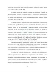 gobierno que la caracterizan darán forma a los resultados de desarrollo local en aquellas zonas donde se localicen (Gereffi, 2001). Las cadenas globales de producción a menudo son globales en el sentido que atraviesan fronteras nacionales e incorporan empresas y trabajadores en diferentes países; son también locales debido a los vínculos particulares que la cadena origina en distintas comunidades (Bair y Gereffi, 2003). Las cadenas globales de producción tienen cuatro características: (1) una estructura de entrada-salida, que describe el proceso de transformación de materias primas a los productos finales; (2) una territorialidad o dispersión espacial de las actividades involucradas en esta transformación; (3) la estructura de gobierno, que describe las relaciones de poder que ejercen a lo largo de la cadena y (4) Un contexto institucional que da forma a las redes entre las empresas que conectan varios eslabones en la cadena y median los resultados asociados con la operación de la cadena en diferentes ambientes (Gereffi y Korzeniewicz, 1994, Gereffi, 1999, Bair y Gereffi, 2003). “Las cadenas globales de producción se refieren a toda la gama de actividades relacionadas con el diseño, producción y comercialización de un producto. Una distinción crítica en este enfoque es entre la cadena global de producción dirigida por el productor y la cadena global de producción dirigida por el comprador” (Gereffi, 1999: 38). Las cadenas de producción dirigidas por el comprador y las dirigidas por el productor representan modos alternativos de organización de las industrias a nivel internacional. Estas cadenas productivas aunque principalmente son controladas por agentes económicos privados, también están influenciadas por las políticas de gobierno, tanto en las importaciones como en exportaciones (Gereffi, 1994). 29