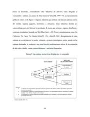 países en desarrollo. Generalmente estas industrias de artículos están dirigidas al consumidor y utilizan una mano de obra intensiva” (Gereffi, 1994: 97); su representación gráfica la vemos en la figura 5. Algunas industrias que utilizan este tipo de cadenas son las del vestido, zapatos, juguetes, electrónica y artesanías. Estas industrias diseñan y/o comercializan, pero no fabrican los productos de marca que ordenan. Algunos detallistas y empresas orientadas a la moda son Wal-Mart, Sears y J.C. Penny; además marcas como Liz Claiborne, The Cap y The Limited (Gereffi, 1994 y Gereffi, 2001). Las ganancias de estas cadenas no se derivan de la escala, volumen o avances tecnológicos, como sucede en las cadenas destinadas al productor, sino más bien de combinaciones únicas de investigación de alto valor, diseño, ventas, comercialización y servicios financieros. Figura 5. Las cadenas productivas dirigidas por el comprador MERCADO EXTRANJERO DE ESTADOS UNIDOS Comercializadores de marca Comerciante Fábricas Detallistas Compradores del extranjero Fabricantes de marca NOTAS: Las flechas con línea continua representan relaciones primarias, las flechas con línea discontinua representan relaciones secundarias. Los vendedores al detalle, los comercializadores de marcas y los comerciantes requieren suministros de paquete completo de las fábricas situadas en el extranjero. Los fabricantes de marcas embarcan piezas para ensamblar en el extranjero y vuelven a exportar al mercado nacional del fabricante. Fuente: (Gereffi, 2001: 15) 32