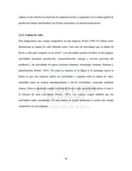 cadena es más abierta a la inserción de empresas locales o regionales en la cadena global de producción dando oportunidad a las Pymes mexicanas a la internacionalización. 1.2.3. Cadena de valor Para diagnosticar una ventaja competitiva en una empresa, Porter (1991:73) utiliza como herramienta la cadena de valor definida como “una serie de actividades que se deben de llevar a cabo para competir en un sector”. Las actividades pueden dividirse en dos grupos: actividades primarias (producción, comercialización, entrega y servicio posventa del producto) y las actividades de apoyo (recursos humanos, tecnología, insumos, finanzas y planificación) (Porter, 1991). Tal como se muestra en la figura 6, la estrategia marca la forma en que una empresa realiza sus actividades y organiza toda la cadena de valor, entendida como un sistema interdependiente o red de actividades, conectado mediante enlaces. Éstos se producen cuando la forma de llevar a cabo una actividad afecta el costo o la eficacia de otras actividades (Porter, 1991). Los enlaces exigen también que las actividades estén coordinadas. De esta manera se puede determinar si existe una ventaja competitiva en una empresa. 34