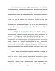 De lo anterior se deriva el concepto de gobernanza que es central para el análisis de la cadena de producción. Gobernabilidad es definido como “la coordinación de la actividad económica que no es de mercado. El punto de partida para el interés en las cadenas globales de producción es el hecho de que algunas empresas directa o indirectamente, influyen en la organización de la producción mundial, los sistemas de logística y comercialización” (Gereffi et al., 2001: 4). A través de las estructuras de gobierno que crean, toman decisiones que tienen importantes consecuencias para el acceso de empresas de los países en desarrollo a los mercados internacionales. Es por ello que tienen gran relevancia las estrategias de las empresas transnacionales para el desarrollo internacional de los proveedores locales. Las estrategias de los corporativos tienen como objetivo principal el posicionamiento de la cadena en el mercado, de esta manera, la firma líder determina que productos y que características (calidad, apariencia, empaquetado, etc.) ofrece a sus consumidores. En este sentido, las estrategias corporativas tienen influencia en la estructura total de la cadena, el tipo y número de firmas involucradas, así como la distribución de funciones de las mismas. También influyen en las decisiones específicas sobre los productores o exportadores que son incluidos o excluidos de la cadena (García de León, 2009). Pietrolli y Saliola (2008) han puesto de manifiesto, para el caso de Tailandia, que una mayor vinculación de los grandes compradores multinacionales con los proveedores locales, está asociada a mayores niveles de productividad de estos últimos. En algunos casos las mismas grandes corporaciones que asumen la gobernanza de la cadena estimulan estos procesos de mejora y acceso a estándares técnicos, a fin de garantizarse un mejor suministro de bienes y servicios que contratan con proveedores externos (Romero, 2009). 37