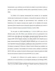 transnacionales y que conforman una seria barrera de entrada a los proveedores locales, ya que éstos no tienen la capacidad de enfrentar dichos requerimientos (Contreras y Carrillo, 2004). Las filiales de las empresas transnacionales han mostrado ser un importante vehículo para la modernización de la industria y el desarrollo de empresas en México. Sin embargo, sus propias estrategias de aprovisionamiento local, combinadas con las limitaciones de las empresas mexicanas para cumplir con los estándares del mercado, representan fuertes obstáculos para un desarrollo regional más equilibrado que involucre a una mayor cantidad de empresas nacionales (Contreras y Carrillo, 2004). Por otra parte, un estudio desarrollado por la UNCTAD (2007) que se hizo en diferentes países, entre ellos México, para determinar cuál era la participación de las PyMES locales en las cadenas de valor mundiales, encontraron que en Volkswagen México ninguna PyME local ha logrado vincularse a la cadena mundial como trampolín para su propia internacionalización. Las grandes empresas declararon que en la mayoría de los casos importaban insumos del extranjero y añadían poco valor a sus productos a nivel local. No obstante, las empresas FTE Mexicana y Johnson Controls, afirmaron que ayudaban a sus proveedores a aumentar el valor añadido de los insumos locales, mediante la certificación ISO/TS 16949, que constituye la norma de referencia para el sistema de gestión de calidad del sector del automóvil, basado en la norma ISO 9001 (UNCTAD, 2007). Un ejemplo de la influencia de las grandes empresas en la cadena global de 6 producción en el sector electrónico es la investigación realizada por Luis Berlanga (1999) , 6 Para realizar esta investigación, las empresas maquiladoras que forman parte de la muestra se tomaron de la SECOFI en Tijuana y son las que aparecen registradas como Japonesas (32 empresas); además de que la información de valor 39
