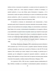 realizan servicios a mercancías de exportación o se prestan servicios de exportación; 3) la de albergue, cuando una o varias empresas extranjeras le faciliten la tecnología y el material productivo, sin que estas últimas operen directamente el programa; y 4) la terciarización, cuando una empresa certificada que no cuente con instalaciones para realizar procesos productivos, realice las operaciones de manufactura a través de terceros que registre en su programa (Diario Oficial de la Federación, 2006). El desarrollo de relaciones de subcontratación entre transnacionales y Pymes nacionales puede iniciar la formación de estructuras industriales interconectadas, siempre y cuando se dé una transferencia de tecnología u obligue a los subcontratistas a modernizarse. Hasta finales de los noventa, la subcontratación desempeñaba un rol marginal en México, ya que predominaba un pequeño número de grandes empresas que importan la mayor parte de los insumos necesarios. El aporte de las Pymes a la producción industrial es muy bajo. Es típico que las Pymes nacionales produzcan con métodos obsoletos y a costos excesivos y que no se beneficien de los conocimientos de las grandes empresas (Altenburg et al., 1998). Sin embrago, Moctezuma y Mungaray (1997), a través de una encuesta realizada en 1993 encontraron que el 34.5% de las micro y pequeñas empresas fronterizas mexicanas recibieron subcontratos, situación que se presentó en Monterrey en más del 52% de estas empresas. Ellos concluyen que existen ventajas de esta estrategia, en particular para el contratista, que ha configurado un esquema de operación asimétrico y autoritario; sin embargo, debe impulsarse con mayor fuerza entre las empresas mexicanas porque aumenta el mercado de las pequeñas y medianas empresas (Moctezuma y Mungaray, 1997). En el periodo de 1986 a 1998, las micro y pequeñas empresas metalmecánicas de Baja California vinculadas con actividades de subcontratación pudieron incrementar su 42