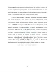 años setenta grandes empresas transnacionales pusieron sus ojos en el norte de México, que fue una de las principales regiones propicias para las operaciones de ensamble con el uso intensivo de mano de obra barata (Barajas, 2009), lo que significa que el desarrollo de la maquila en nuestro país ha tenido efectos sobre la creación de empleos. Fue en 1986 cuando se empezó a registrar un fenómeno de redistribución geográfica de la industria maquiladora a nivel nacional y en Sonora, desplazándose de la zona fronteriza a otras ciudades no fronterizas tanto de Sonora como de otros estados del país (Lara et al., 2009). Durante el periodo 1986-2006 la maquiladora de exportación presentó un proceso de expansión a nivel nacional, pasó de 890 plantas y aproximadamente 250,000 trabajadores en 1986 a poco más de 2,800 plantas y un millón doscientos mil empleos en 2006 (Lara y Osuna, 2008). Después del 2006 hubo un cambio en el régimen fiscal de esta industria, donde se incluyeron las empresas que prestan servicios a la industria maquiladora, es por ello que se ve una clara diferencia entre el año 2006 y los años posteriores. Sin embargo, del 2007 al 2010 vemos un aumento en el número de establecimientos, pero una disminución en el total de personal ocupado. Ver gráfica 1 47