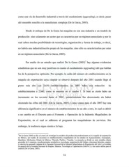 como una vía de desarrollo industrial a través del escalamiento (upgrading), es decir, pasar del ensamble sencillo a la manufactura compleja (De la Garza, 2005). Desde el enfoque de De la Garza las maquilas no son una industria o un modelo de producción sino solamente un sector que se caracteriza por un régimen arancelario y por lo cual caben muchas posibilidades de tecnologías, organización y fuerza de trabajo, es decir, no habría una industrialización propia de las maquilas, sino sólo se caracterizarían por estar en un régimen arancelario (De la Garza, 2005). 7 Por medio de un estudio que realizó De la Garza (2005) hay algunas evidencias estadísticas que no son muy positivas en cuanto al escalamiento (upgrading) del que hablan los de la perspectiva optimista. Por ejemplo, la caída del número de establecimientos en la maquila de exportación cuya cúspide se observó después del año 2001 cuando llego al punto más alto con 3,630 establecimientos; en 2003 hubo una reducción de establecimientos a 2,860, como se muestra en el cuadro 1. Si bien es cierto hubo un incremento en los noventa hasta el 2001, posteriormente fue decreciendo sin haber alcanzado las cifras del 2001 (De la Garza, 2005). Como vemos para el año 2007 hay una diferencia significativa en el número de establecimientos de un año a otro, lo cual se debió a un cambio en el Decreto para el Fomento y Operación de la Industria Maquiladora de Exportación, en el cual se adhieren al programa las maquiladoras de servicios. Sin embargo, la tendencia sigue siendo a la baja. 7 De la Garza (2005) se dio a la tarea de investigar los modelos de producción predominantes en la maquila de exportación en México, por medio de encuestas en establecimientos maquiladores de los estados de Aguascalientes, Guanajuato, Querétaro, Michoacán, Estado de México, Tlaxcala, Puebla y Yucatán. La encuesta se divide en siete módulos (datos generales de la empresa, encadenamientos productivos, tecnología, organización del trabajo, relaciones laborales, empleo y rotación de personal), además de la Encuesta Nacional de la Industria Maquiladora de Exportación del INEGI y el módulo de maquila de la Encuesta Nacional de Empleo, Salarios, Tecnología y Capacitación (ENESTYC) y las cuales utiliza para el análisis (De la Garza, 2005). 51
