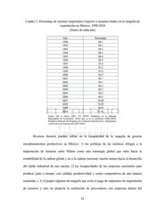Cuadro 2. Porcentaje de insumos importados respecto a insumos totales en la maquila de exportación en México, 1990-2010 (Enero de cada año) Año Porcentaje 1990 98.1 1992 98.1 1993 98.3 1994 98.5 1995 98.4 1996 98.4 1997 97.9 1998 97.4 1999 97.0 2000 96.9 2001 96.7 2002 96.1 2003 96.3 2004 96.7 2005 96.5 2006 96.4 2007 76.04 2008 76.03 2009 76.01 2010 71.81 Fuente: (De la Garza, 2005: 23); INEGI. Estadística de la Industria Maquiladora de Exportación. Series que ya no se actualizan (2004-2006); Estadística Mensual del Programa de la Industria Manufacturera, Maquiladora y de Servicios de Exportación (2007-2010) Diversos factores pueden influir en la incapacidad de la maquila de generar encadenamientos productivos en México: 1) las políticas de las matrices obligan a la importación de insumos entre filiales como una estrategia global que mira hacia la rentabilidad de la cadena global y no a la cadena nacional, mucho menos hacia el desarrollo del tejido industrial de una nación; 2) las incapacidades de las empresas nacionales para producir justo a tiempo, con calidad, productividad y costos competitivos de una manera sostenida; y 3) el propio régimen de maquila que evita el pago de impuestos de importación de insumos y esto no propicia la sustitución de proveedores con empresas dentro del 53