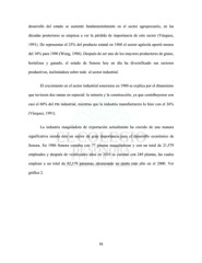 desarrollo del estado se sustentó fundamentalmente en el sector agropecuario, en las décadas posteriores se empieza a ver la pérdida de importancia de este sector (Vázquez, 1991). De representar el 25% del producto estatal en 1960 el sector agrícola aportó menos del 10% para 1990 (Wong, 1996). Después de ser uno de los mayores productores de grano, hortalizas y ganado, el estado de Sonora hoy en día ha diversificado sus sectores productivos, inclinándose sobre todo al sector industrial. El crecimiento en el sector industrial sonorense en 1980 se explica por el dinamismo que tuvieron dos ramas en especial: la minería y la construcción, ya que contribuyeron con casi el 60% del PIB industrial, mientras que la industria manufacturera lo hizo con el 36% (Vázquez, 1991). La industria maquiladora de exportación actualmente ha crecido de una manera significativa siendo éste un sector de gran importancia para el desarrollo económico de Sonora. En 1986 Sonora contaba con 77 plantas maquiladoras y con un total de 21,579 empleados y después de veinticuatro años en 2010 se cuentan con 249 plantas, las cuales emplean a un total de 82,179 personas, alcanzando su punto más alto en el 2000. Ver gráfica 2. 56