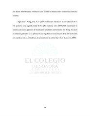 una buena infraestructura carretera la cual facilitó las transacciones comerciales entre los sectores. Siguiendo a Wong, Lara et al. (2009) continuaron estudiando la relocalización de la IME posterior a la segunda mitad de los años ochenta, entre 1990-2005 encontrando la ausencia de nuevos patrones de localización señalados anteriormente por Wong. Es decir, en términos generales no se aprecia un nuevo patrón de relocalización de la IME en Sonora, aun cuando continúa la tendencia de relocalización al interior del estado (Lara et al.,2009). 59