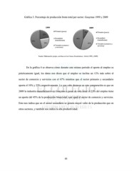 Gráfica 3. Porcentaje de producción bruta total por sector. Guaymas 1999 y 2009 1999 2009 Primario (pesca) 9% Primario (pesca) 22% Secundario 46% Secundario 54% (manufactura) (manufactura) 24% 45% Terciario (comercio y Terciario (comercio servicios) y servicios) Fuente: Elaboración propia, con base en los Censos Económicos, INEGI (1999 y 2009) En la gráfica 4 se observa cómo durante este mismo periodo el aporte al empleo es prácticamente igual, los datos nos dicen que el empleo se inclina un 12% más sobre el sector de comercio y servicios con el 67% mientras que el sector primario y secundario aporta el 10% y 23% respectivamente. Lo que cabe destacar en esta comparación es que en 2009 la industria manufacturera en Guaymas a pesar de solo tener el 23% del empleo tiene un aporte del 45% de la producción bruta total, casi igual al sector de comercio y servicios. Esto nos indica que en el sector secundario se genera mayor valor de la producción que en otros sectores, y también nos indica la alta productividad. 65