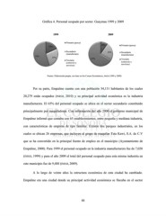 Gráfica 4. Personal ocupado por sector. Guaymas 1999 y 2009 1999 2009 Primario (pesca) 10% Primario (pesca) 18% Secundario 23% Secundario (manufactura) (manufactura) 55% 27% 67% Terciario Terciario (comercio y (comercio y servicios) servicios) Fuente: Elaboración propia, con base en los Censos Económicos, INEGI (1999 y 2009) Por su parte, Empalme cuenta con una población 54,131 habitantes de los cuales 20,279 están ocupados (INEGI, 2010) y su principal actividad económica es la industria manufacturera. El 65% del personal ocupado se ubica en el sector secundario constituido principalmente por maquiladoras. Con información del año 2000 el gobierno municipal de Empalme informó que contaba con 65 establecimientos, entre pequeña y mediana industria, con características de empresa de tipo familiar. Existen dos parques industriales, en los cuales se ubican 26 empresas, que incluyen al grupo de maquilas Teta Kawi, S.A. de C.V que se ha convertido en la principal fuente de empleo en el municipio (Ayuntamiento de Empalme, 2000). Para 1999 el personal ocupado en la industria manufacturera fue de 7,020 (INEGI, 1999) y para el año 2009 el total del personal ocupado para esta misma industria en este municipio fue de 9,488 (INEGI, 2009). A lo largo de veinte años la estructura económica de esta ciudad ha cambiado. Empalme era una ciudad donde su principal actividad económica se fincaba en el sector 66