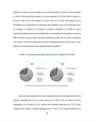 importante, aunque en menor medida, con el 65% del empleo. El sector terciario empleaba en 1999 al 24% del personal ocupado y el sector pesquero el 4%. Para 2009 el comercio y servicios tenían al 33% del empleo y la pesca solo el 2%. Aquí cabe destacar que la manufactura es la aportación más importante para Empalme, tanto en la producción como en el empleo. Ver gráfica 6. Al comparar a Guaymas y Empalme en el 2009 nos damos cuenta que Empalme tiene una gran producción en la manufactura, sin embargo la mano de obra es intensiva ya que ocupa a una gran cantidad de personas. Por otro lado, en Guaymas solo ocupa el 23% de los empleados, pero tiene una producción bruta mucho mayor, lo que significa que Guaymas tiene mayor productividad que Empalme. Gráfica 6. Porcentaje de personal ocupado por sector. Empalme 1999-2009 1999 2009 4% 2% Primario (pesca) Primario (pesca) 24% 33% Secundario Secundario (manufactura) (manufactura) 65% 72% Terciario Terciario (comercio y (comercio y servicios) servicios) Fuente: Elaboración propia, con base en los Censos Económicos, INEGI (1999 y 2009) Haciendo una comparación con otras ciudades del estado, los establecimientos de la industria manufacturera con que cuenta Guaymas en 2009 es de 538 plantas con una participación en el estado de 5.5%, mientras que Empalme participa con el 2.3%. Otras ciudades como Cajeme y Nogales participan con el 16.8% y 4.9% respectivamente de los 68