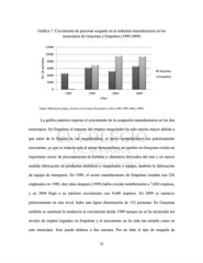 Gráfica 7. Crecimiento de personal ocupado en la industria manufacturera en los municipios de Guaymas y Empalme (1989-2009) 12000 10000 No. de personas 6000 Guaymas 8000 4000 2000 Empalme 0 1989 1999 2004 2009 Años Fuente: Elaboración propia, con base en los Censos Económicos, INEGI (1989, 1999, 2004 y 2009). La gráfica anterior expresa el crecimiento de la ocupación manufacturera en los dos municipios. En Empalme el impacto del empleo maquilador ha sido mucho mayor debido a que antes de la llegada de las maquiladoras, el sector manufacturero era prácticamente inexistente, ya que se reducía solo al sector ferrocarrilero, en cambio en Guaymas existía un importante sector de procesamiento de bebidas y alimentos derivados del mar y en menor medida fabricación de productos metálicos y maquinaria y equipo, también la fabricación de equipo de transporte. En 1989, el sector manufacturero de Empalme contaba con 226 empleados en 1989, diez años después (1999) había crecido notablemente a 7,020 empleos, y en 2004 llegó a su máximo crecimiento con 9,640 empleos. En 2009 se mantuvo prácticamente en este nivel, hubo una ligera disminución de 152 personas. En Guaymas también se mantiene la tendencia al crecimiento desde 1989 aunque no se ha alcanzado los niveles de empleo logrados en Empalme y el incremento no ha sido tan notable como en este municipio. Esto puede deberse a dos razones. Por un lado el tipo de maquila de 72