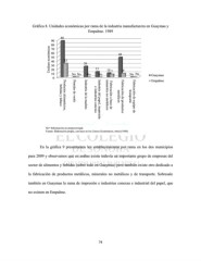 Gráfica 8. Unidades económicas por rama de la industria manufacturera en Guaymas y Empalme. 1989 88 90 80 Unidaes económicas 60 33 26 48 70 50 40 30 20 10 No No No 13 No 10 7 9 No No Guaymas 0 Empalme Prendas de vestir transporte metálicos bebidas y tabaco Fabricación a base de Industria de la madera minerales no metálicos Productos alimenticios, e industrias conexas Fabricación de productos Fabricación de equipo de Industria del papel, impresión No= Información no proporcionada Fuente: Elaboración propia, con base en los Censos Económicos, INEGI (1989). En la gráfica 9 presentamos los establecimientos por rama en los dos municipios para 2009 y observamos que en ambas existe todavía un importante grupo de empresas del sector de alimentos y bebidas (sobre todo en Guaymas) pero también existe otro dedicado a la fabricación de productos metálicos, minerales no metálicos y de transporte. Sobresale también en Guaymas la rama de impresión e industrias conexas e industrial del papel, que no existen en Empalme. 74