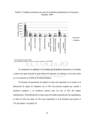 Gráfica 9. Unidades económicas por rama de la industria manufacturera en Guaymas y Empalme. 2009 250 211 Unidades económicas 200 97 47 24 31 10 28 10 8 No 30 No 14 24 85 27 14 9 150 100 50 0 Guaymas Empalme tabaco conexas Prendas de vestir metálicos transporte Industria del papel Industria alimentaria Industria de bebidas y Industria de la madera Impresión e industrias Fabricación a base de minerales no metálicos Fabricación de productos Fabricación de equipo de No= Información no proporcionada Fuente: Elaboración propia, con base en los Censos Económicos, INEGI (2009). Si comparamos las gráficas 8 y 9 veremos que la industria alimentaria y de bebidas y tabaco aún sigue teniendo un gran número de empresas; sin embargo, en las otras ramas se ve un aumento en el número de establecimientos. En términos de generación de empleos la rama más importante en la región es la fabricación de equipo de transporte con el 54% del personal ocupado que sumada a productos metálicos y no metálicos, aportan entre las tres, el 62% del empleo manufacturero. Presumiblemente la mayor parte del empleo generado por las maquiladoras se ubica en estas tres ramas. El otro sector importante es el de alimentos pues genera el 27% del empleo. Ver gráfica 10. 75