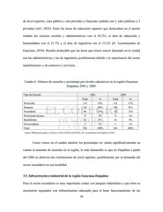 de nivel superior, (una pública y otra privada) y Guaymas contaba con 5, (dos públicas y 3 privadas) (SEP, 2010). Entre las áreas de educación superior que destacaban en el puerto estaban las ciencias sociales y administrativas con el 45.2%; el área de educación y humanidades con el 21.7% y el área de ingeniería con el 33.2% (H. Ayuntamiento de Guaymas, 2010). Resulta destacable que las áreas que tienen mayor demanda en la ciudad son las administrativas y las de ingeniería, posiblemente debido a la importancia del sector manufacturero y de comercio y servicios. Cuadro 6. Número de escuelas y porcentaje por niveles educativos en la región Guaymas- Empalme 2002 y 2009. Tipo de Escuela 2002 2009 Total % Total % Preescolar 114 34% 133 37% Primaria 148 44% 149 41% Secundaria 48 14% 56 15% Profesional técnico 8 2% 4 1% Bachillerato 15 4% 16 4% Universidades 3 1% 5 1% Total 336 100% 363 100% Fuente: Elaboración propia, con base en INEGI (2010); SEP (2010) y H. Ayuntamiento de Empalme (2010) Como vemos en el cuadro anterior los porcentajes no varían significativamente en cuanto al aumento de escuelas en la región, lo más destacable es que en Empalme a partir del 2006 se abrieron dos instituciones de nivel superior, posiblemente por la demanda del sector secundario en esa localidad. 3.5. Infraestructura industrial de la región Guaymas-Empalme Para el sector secundario es muy importante contar con parques industriales y que éstos se encuentren equipados con infraestructura adecuada para el buen funcionamiento de las 79