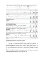Cuadro 7. Índice de productividad del valor agregado por trabajador por sector en los municipios de Guaymas y Empalme 2009 1/ (Miles de pesos) (Año base 2003=100) Sector Empalme Guaymas Región Pesca, acuicultura y servicios relacionados con las actividades agropecuarias y $18 $106 $124 forestales Minería $0 $0 $0 Generación, transmisión y distribución de energía eléctrica, suministro de $151 $192 $343 agua y de gas por ductos al consumidor final $475 $72 $547 Construcción $241 $227 $469 Industrias manufactureras $44 $91 $134 Comercio Transportes, correos y almacenamiento $34 $31 $66 $285 $212 $497 Información en medios masivos $22 $61 $83 Servicios financieros y de seguros $2 $86 $88 Servicios inmobiliarios y de alquiler de bienes muebles e intangibles Servicios profesionales, científicos y técnicos $13 $41 $54 Servicios de apoyo a los negocios y manejo de desechos y servicios de 15 remediación -$24 $94 $70 $46 $71 $117 Servicios educativos $54 $26 $80 Servicios de salud y asistencia social Servicios de esparcimiento culturales y deportivos, y otros servicios $20 $115 $135 recreativos $31 $36 $67 Servicios de alojamiento temporal y de preparación de alimentos y bebidas Otros servicios excepto actividades gubernamentales $13 $22 $35 $1,427 $1,483 $2,190 TOTAL 1/ Es el resultado de dividir el valor agregado censal bruto entre el personal ocupado Fuente: Elaboración propia, con base en los Censos Económicos, INEGI (2009). En el caso de la manufactura también se calculó y comparó el valor agregado por trabajador de las distintas ramas que integran este sector, ya que son dos municipios con una gran presencia de industria manufacturera y maquiladora. Las ramas que contribuyen 15 Presenta número negativo debido a que son empresas que tienen la misma razón social que el establecimiento al que apoyan y no generan ingresos por la prestación de servicios. También pueden ser empresas dedicadas a las actividades no lucrativas, que reciben subsidios o que están en proceso de quiebra (INEGI, 2009). 85