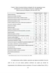Cuadro 8. Índice de productividad por trabajador del valor agregado por rama manufacturera en los municipios de Guaymas y Empalme 2009. (Miles de pesos por trabajador) (Año base 2003=100) Ramas manufactureras Empalme Guaymas Región Industria alimentaria $33 $141 $174 Industria de las bebidas y del tabaco $31 $22 $53 Fabricación de insumos textiles y acabado de textiles $0 $0 $0 Fabricación de productos textiles, excepto prendas de vestir $0 $72 $72 Fabricación de prendas de vestir $187 $9 $196 Curtido y acabado de cuero y piel, y fabricación de productos de $263 $6 $270 cuero, piel y materiales sucedáneos Industria de la madera $47 $55 $102 Industria del papel $0 $6 $6 Impresión e industrias conexas $64 $25 $89 Fabricación de productos derivados del petróleo y del carbón $0 $0 $0 Industria química $0 $3 $3 Industria del plástico y del hule $256 $474 $730 Fabricación de productos a base de minerales no metálicos $16 $168 $184 Industrias metálicas básicas $0 $16 $16 Fabricación de productos metálicos $119 $54 $173 Fabricación de maquinaria y equipo $110 $1,337 $1,447 Fabricación de equipo de computación, comunicación, medición y de otros equipos, componentes y accesorios electrónicos $82 $102 $184 Fabricación de accesorios, aparatos eléctricos y equipo de generación de energía eléctrica $153 $0 $153 Fabricación de equipo de transporte $309 $349 $658 Fabricación de muebles, colchones y persianas $15 $42 $57 Otras industrias manufactureras $316 $151 $467 TOTAL $2,000 $3,033 $5,033 Fuente: Elaboración propia, con base en los Censos Económicos, INEGI (2009). Al complementarse ambas ciudades, suponemos que algunas necesidades de una las cubre la otra y de esta manera pudieran conformar una región que atiende los requerimientos de los diferentes sectores económicos. Tal como lo señalan Porter (1991) y 87