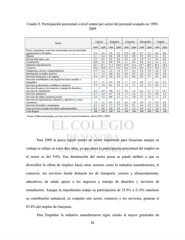 Cuadro 9. Participación porcentual a nivel estatal por sector del personal ocupado en 1999- 2009 Cajeme Empalme Guaymas Hermosillo Nogales Sector 1999 2009 1999 2009 1999 2009 1999 2009 1999 2009 Pesca, acuacultura y servicios relacionados con las actividades agropecuarias y forestales 2.0 3.6 3.9 2.2 17.6 9.0 0.7 2.2 0.0 0.0 Minería 0.1 0.4 0.0 0.0 0.0 0.0 0.5 0.8 0.1 0.1 Electricidad, agua y gas 0.5 0.5 0.9 0.6 0.8 1.0 3.4 2.7 0.4 0.4 Construcción 14.8 5.6 0.0 0.0 3.1 6.6 9.0 8.2 2.4 2.1 Industrias manufactureras 22.7 25.1 71.3 64.9 25.9 21.6 25.7 20.7 63.5 54.6 Comercio 29.4 28.0 13.7 14.5 24.2 27.9 28.3 27.2 14.3 15.7 Transportes, correos y almacenamiento 2.7 3.1 1.3 1.9 5.7 6.2 3.4 2.9 4.0 1.8 Información en medios masivos 2.1 1.5 0.0 0.2 0.8 0.7 2.6 2.5 0.9 0.4 Servicios financieros y de seguros 0.4 0.7 0.0 0.3 0.6 0.6 0.3 0.7 0.3 0.6 Servicios inmobiliarios y de alquiler de bienes muebles e intangibles 0.7 1.1 0.2 0.8 1.1 1.9 0.8 1.5 0.4 0.7 Servicios profesionales, científicos y técnicos 2.3 3.4 0.2 0.3 1.9 2.1 2.8 3.3 0.9 1.3 Servicios de apoyo a los negocios y manejo de desechos y servicios de remediación 4.6 6.9 0.0 3.7 0.6 1.6 6.2 6.7 1.9 10.1 Servicios educativos 2.7 2.4 0.7 1.0 1.7 2.4 2.7 3.3 0.8 1.4 Servicios de salud y asistencia social 2.2 3.3 0.8 2.1 1.3 3.0 2.2 3.4 1.1 2.5 Servicios de esparcimiento culturales y deportivos, y otros recreativos 1.0 2.2 0.3 0.3 0.6 1.0 0.9 1.0 0.4 0.3 Servicios de hoteles y restaurantes 5.3 6.2 2.7 3.7 9.2 9.1 4.6 6.2 5.6 4.9 Otros servicios excepto actividades gubernamentales 6.5 6.0 4.0 3.4 4.8 5.3 6.0 6.7 3.0 3.2 Total Región 100 100 100 100 100 100 100 100 100 100 Fuente: Elaboración propia, con base en los Censos Económicos, INEGI (1999 y 2009) Para 2009 la pesca siguió siendo un sector importante para Guaymas aunque su ventaja se redujo en estos diez años, ya que ahora la participación porcentual del empleo en el sector es del 9.0%. Esa disminución del sector pesca se puede atribuir a que se diversificó la oferta de empleos hacia otros sectores como la industria manufacturera, el comercio, los servicios donde destacan los de transporte, correos y almacenamiento, educativos, de salud, apoyo a los negocios y manejo de desechos y servicios de remediación. Aunque la manufactura redujo su participación de 25.9% a 21.6% mantiene su contribución sustancial, en conjunto este sector, comercio y los servicios, generan el 83.4% del empleo de Guaymas. Para Empalme la industria manufacturera sigue siendo el mayor generador de 91