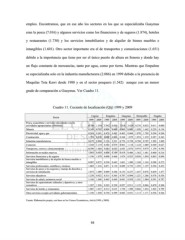 empleo. Encontramos, que en ese año los sectores en los que se especializaba Guaymas eran la pesca (7.016) y algunos servicios como los financieros y de seguros (1.874), hoteles y restaurantes (1.730) y los servicios inmobiliarios y de alquiler de bienes muebles e intangibles (1.601). Otro sector importante era el de transportes y comunicaciones (1.651) debido a la importancia que tiene por ser el único puerto de altura en Sonora y donde hay un flujo constante de mercancías, tanto por agua, como por tierra. Mientras que Empalme se especializaba solo en la industria manufacturera (2.086) en 1999 debido a la presencia de Maquilas Teta Kawi desde 1988 y en el sector pesquero (1.542) aunque con un menor grado de comparación a Guaymas. Ver Cuadro 11. Cuadro 11. Cociente de localización (Qij) 1999 y 2009 Cajeme Empalme Guaymas Hermosillo Nogales Sector 1999 2009 1999 2009 1999 2009 1999 2009 1999 2009 Pesca, acuacultura y servicios relacionados con las actividades agropecuarias y forestales 0.786 1.354 1.542 0.835 7.016 3.429 0.276 0.825 0.011 0.000 Minería 0.343 0.782 0.000 0.000 0.000 0.000 1.950 1.642 0.229 0.134 Electricidad, agua y gas 0.268 0.301 0.479 0.403 0.462 0.604 1.870 1.705 0.204 0.264 Construcción 1.759 0.910 0.000 0.001 0.368 1.079 1.074 1.339 0.287 0.343 Industrias manufactureras 0.679 0.860 2.136 2.221 0.776 0.738 0.768 0.707 1.902 1.869 Comercio 1.169 1.119 0.544 0.579 0.961 1.118 1.124 1.089 0.569 0.627 Transportes, correos y almacenamiento 0.789 1.054 0.383 0.652 1.651 2.076 0.974 0.979 1.159 0.594 Información en medios masivos 1.093 0.910 0.000 0.109 0.419 0.406 1.362 1.481 0.460 0.216 Servicios financieros y de seguros 1.196 1.070 0.000 0.466 1.874 0.925 0.856 1.054 0.863 0.896 Servicios inmobiliarios y de alquiler de bienes muebles e intangibles 0.987 0.875 0.330 0.643 1.601 1.490 1.108 1.163 0.588 0.573 Servicios profesionales, científicos y técnicos 1.085 1.216 0.071 0.110 0.889 0.735 1.293 1.197 0.394 0.453 Servicios de apoyo a los negocios y manejo de desechos y servicios de remediación 1.073 1.009 0.009 0.546 0.133 0.237 1.437 0.976 0.439 1.477 Servicios educativos 1.230 0.922 0.315 0.365 0.787 0.894 1.221 1.266 0.376 0.536 Servicios de salud y asistencia social 1.166 1.048 0.445 0.669 0.681 0.958 1.181 1.084 0.591 0.787 Servicios de esparcimiento culturales y deportivos, y otros recreativos 1.287 1.936 0.362 0.250 0.857 0.911 1.135 0.866 0.470 0.304 Servicios de hoteles y restaurantes 1.007 1.015 0.514 0.615 1.730 1.500 0.866 1.016 1.063 0.799 Otros servicios excepto actividades gubernamentales 1.196 1.050 0.730 0.599 0.883 0.931 1.115 1.171 0.556 0.564 Fuente: Elaboración propia, con base en los Censos Económicos, INEGI (1999 y 2009) 93