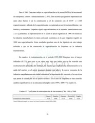 Para el 2009 Guaymas redujo su especialización en la pesca (3.429) y la incrementó en transportes, correos y almacenamiento (2.076). Dos sectores que ganaron importancia en estos años fueron el de la construcción y el de comercio con el 1.079 y 1.118 respectivamente. Además de la especialización ya registrada en servicios inmobiliarios y en hoteles y restaurantes. Empalme siguió especializándose en la industria manufacturera con 2.221 y perdiendo la especialización en el sector de pesca registrada en 1999. De hecho es la industria manufacturera la única actividad económica en la que Empalme registró en 2009 una especialización. Estos resultados prueban una de las hipótesis de este trabajo referidas a que se ha conservado la especialización de Empalme en la industria manufacturera. En cuanto a la restructuración, en el periodo 1999-2009 Guaymas tuvo el mayor indicador (0.131), pero aun es un valor muy bajo que indica que no ha ocurrido una reestructuración profunda. Sin embargo, las razones que explican esta restructuración es la caída del empleo en el sector pesquero durante esos años y la mayor presencia de la industria maquiladora en esa ciudad, además de la importancia del comercio y los servicios que presta la ciudad por ser un puerto turístico. En el caso de Empalme no han ocurrido cambios significativos en la estructura del empleo entre 1999 y 2009. Ver cuadro 12. Cuadro 12. Coeficiente de restructuración de los sectores (CRr) 1999 y 2009 Cajeme Empalme Guaymas Hermosillo Nogales Coeficiente de restructuración 0.120 0.089 0.131 0.082 0.128 Fuente: Elaboración propia, con base en los Censos Económicos, INEGI (1999 y 2009) 94