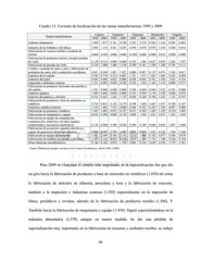 Cuadro 13. Cociente de localización de las ramas manufactureras 1999 y 2009 Cajeme Empalme Guaymas Hermosillo Nogales Ramas manufacturera 1999 2009 1999 2009 1999 2009 1999 2009 1999 2009 Industria alimentaria 2.449 1.977 0.161 0.198 3.225 2.570 0.945 1.226 0.085 0.083 Industria de las bebidas y del tabaco 2.892 1.155 0.431 0.287 0.594 0.978 0.978 1.630 0.304 0.414 Fabricación de insumos textiles y acabado de textiles 0.000 4.958 0.000 0.000 14.509 0.000 0.000 0.016 0.000 0.000 Fabricación de productos textiles, excepto prendas de vestir 0.130 0.514 0.000 0.000 0.182 1.586 0.627 0.858 2.203 1.597 Fabricación de prendas de vestir 0.319 1.808 1.488 1.258 0.390 0.161 1.594 1.440 0.745 0.112 Curtido y acabado de cuero y piel, y fabricación de productos de cuero, piel y materiales sucedáneos 0.051 0.348 1.691 7.422 0.000 0.097 0.137 0.971 2.383 0.017 Industria de la madera 0.765 0.776 0.274 0.407 1.321 1.513 1.923 1.669 0.285 0.489 Industria del papel 0.695 0.488 0.022 0.000 0.248 0.826 0.701 2.186 1.832 0.336 Impresión e industrias conexas 1.331 0.805 0.050 0.109 0.526 1.938 1.343 1.418 0.806 0.737 Fabricación de productos derivados del petróleo y del carbón 1.281 0.000 0.000 0.000 5.244 0.000 0.844 2.922 0.391 0.000 Industria química 1.469 0.848 0.000 0.000 0.353 0.024 2.118 2.349 0.000 0.076 Industria del plástico y del hule 0.213 0.247 1.242 1.732 0.028 0.240 0.798 1.633 1.733 0.747 Fabricación de productos a base de minerales no metálicos 0.719 0.932 0.162 0.279 0.398 1.850 1.667 1.837 0.780 0.187 Industrias metálicas básicas 1.374 1.881 7.515 0.000 0.286 0.343 0.363 1.764 0.097 0.000 Fabricación de productos metálicos 1.287 1.083 0.872 0.327 0.613 0.503 1.452 1.182 0.510 1.005 Fabricación de maquinaria y equipo 0.676 0.390 0.000 0.128 0.000 1.458 1.031 0.875 1.562 1.646 Fabricación de equipo de computación, comunicación, medición y de otros equipos, componentes y accesorios electrónicos 0.128 0.000 0.396 0.582 0.200 0.189 0.846 0.484 1.887 2.408 Fabricación de accesorios, aparatos eléctricos y equipo de generación de energía eléctrica 0.000 0.000 1.329 1.409 0.000 0.000 1.035 0.350 1.584 2.380 Fabricación de equipo de transporte 1.411 1.399 3.193 2.153 1.225 1.086 0.702 0.977 0.546 0.479 Fabricación de muebles, colchones y persianas 1.374 1.156 0.076 0.106 1.259 1.784 1.722 1.748 0.246 0.196 Otras industrias manufactureras 0.146 0.166 0.054 1.350 0.042 0.326 0.659 0.228 2.179 2.365 Fuente: Elaboración propia, con base en los Censos Económicos, INEGI (1999 y 2009) Para 2009 en Guaymas el cambio más importante en la especialización fue que dio un giro hacia la fabricación de productos a base de minerales no metálicos (1.850) tal como la fabricación de artículos de alfarería, porcelana y loza y la fabricación de concreto, también a la impresión e industrias conexas (1.938) especialmente en la impresión de libros, periódicos y revistas, además de la fabricación de productos textiles (1.586). Y También hacia la fabricación de maquinaria y equipo (1.458). Siguió especializándose en la industria alimentaria (2.570) aunque en menor medida. Se dio una pérdida de especialización muy importante en la fabricación de insumos y acabados textiles, se redujo 96