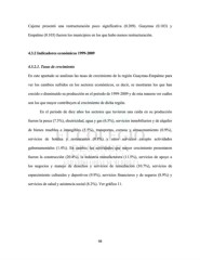 Cajeme presentó una restructuración poco significativa (0.209). Guaymas (0.103) y Empalme (0.103) fueron los municipios en los que hubo menos restructuración. 4.3.2 Indicadores económicos 1999-2009 4.3.2.1. Tasas de crecimiento En este apartado se analizan las tasas de crecimiento de la región Guaymas-Empalme para ver los cambios sufridos en los sectores económicos, es decir, se mostraran los que han crecido o disminuido su producción en el periodo de 1999-2009 y de esta manera ver cuáles son los que mayor contribuyen al crecimiento de dicha región. En el periodo de diez años los sectores que tuvieron una caída en su producción fueron la pesca (7.3%), electricidad, agua y gas (6.5%), servicios inmobiliarios y de alquiler de bienes muebles e intangibles (5.5%), transportes, correos y almacenamiento (0.9%), servicios de hoteles y restaurantes (0.8%) y otros servicios excepto actividades gubernamentales (1.4%). En cambio, las actividades que mayor crecimiento presentaron fueron la construcción (20.4%), la industria manufacturera (11.5%), servicios de apoyo a los negocios y manejo de desechos y servicios de remediación (10.7%), servicios de esparcimiento culturales y deportivos (9.9%), servicios financieros y de seguros (8.9%) y servicios de salud y asistencia social (8.2%). Ver gráfica 11. 98